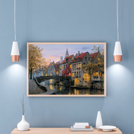 Vivolux | Rote Herbstlandschaft Malerei Brücke zu Häusern Moderne Texturierte Leinwand Wandkunst für Zuhause