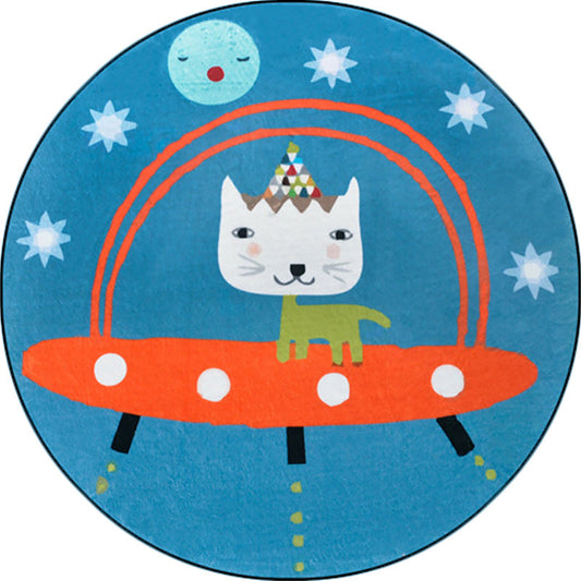 Vivolux | Süßer Kinderteppich in Blau Tier Katze Raumschiff Muster Teppich Polyester Rutschfeste Rückseite Teppich für Kinderzimmer