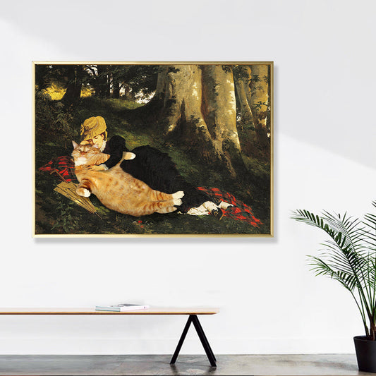Vivolux | Tier-Canvas-Wandkunst Lustiges Spoof-Mädchen und Katze im Wald Gemälde in Braun für das Zimmer