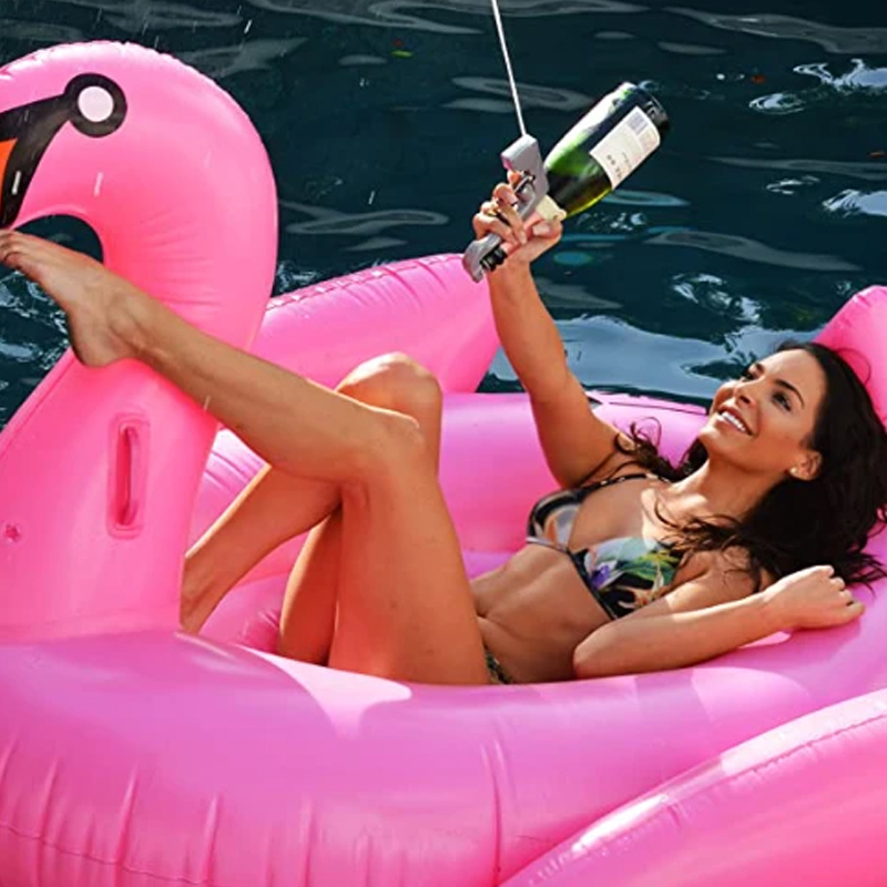 - Einfach zu installieren - Um die Bierpistole zu verwenden, setzen Sie eine Champagnerflasche oder eine andere Flasche auf die Spritze, schütteln Sie sie und sprühen Sie die schäumende Weinflasche auf Ihre Freunde.