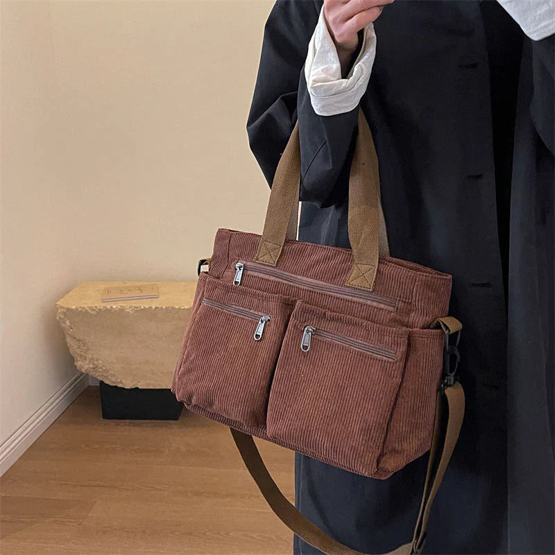 👜 Durchdachtes Design - Verstellbare Schulterriemen, ein Hauptfach mit Reißverschluss für iPad, Geldbörse, Kosmetik, Taschentücher, Regenschirm, Flasche, Magazine, kleine Unterlagen und mehr, sowie eine kleine Reißverschlusstasche und eine offene Innentasche für Handy, Schlüssel, Karten, Kleingeld usw., dazu kommen 3 Reißverschlusstaschen an der Vorderseite der Cordtasche für all Ihre unterschiedlichen Bedürfnisse.