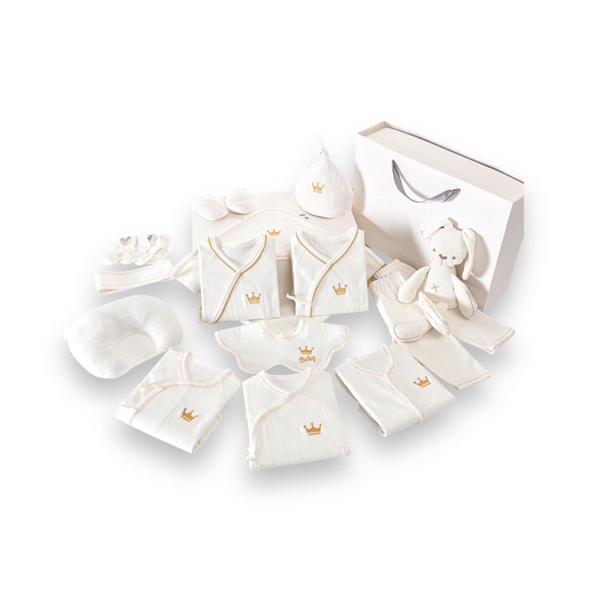 Feiern Sie die Ankunft eines kostbaren neuen Lebens mit unserem charmanten Luxus Geschenkset für Neugeborene. Diese sorgsam ausgesuchte Auswahl an Bekleidung und Zubehör stellt die ideale Möglichkeit dar, um das Neugeborene zu begrüßen und ihm etwas Gutes zu tun. In diesem luxuriösen Set entdecken Sie eine Reihe von bezaubernden und bezaubernden Überraschungen. Von bequemen Bodys und einer kuscheligen Decke bis hin zu niedlichen Mützen und Schuhen wurde jedes Einzelteil speziell ausgewählt, um dem Baby sowohl Komfort als auch Stil zu bieten. Zusätzlich haben wir nützliche Accessoires wie Lätzchen und ein Plüschtier hinzugefügt, um für noch mehr Freude zu sorgen. Egal, ob als Geschenk zur Babyshower oder um frischgebackenen Eltern zu gratulieren, unser Luxus Geschenkset für Neugeborene ist eine durchdachte und nützliche Option. Genießen Sie das Vergnügen des Schenkens und lassen Sie diese Box zu einem besonderen Erinnerungsstück für das Baby und seine Familie werden.