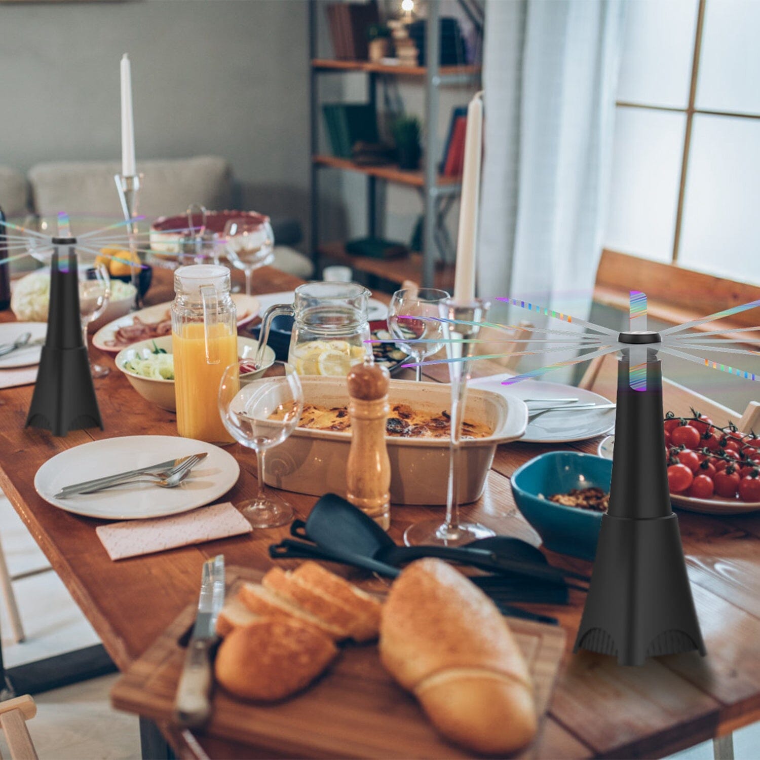 Effektiver Fliegenabwehr-Ventilator: Dieser Ventilator mit seinen reflektierenden Designs kreiert eine Zone auf Ihrem Tisch, die für Fliegen unangenehm ist und verhindert, dass lästige Fliegen oder Insekten an Ihr Essen gelangen. Achten Sie darauf, dass Ihr Essen im optimalen Bereich des Ventilators platziert ist, um die besten Ergebnisse zu erzielen.