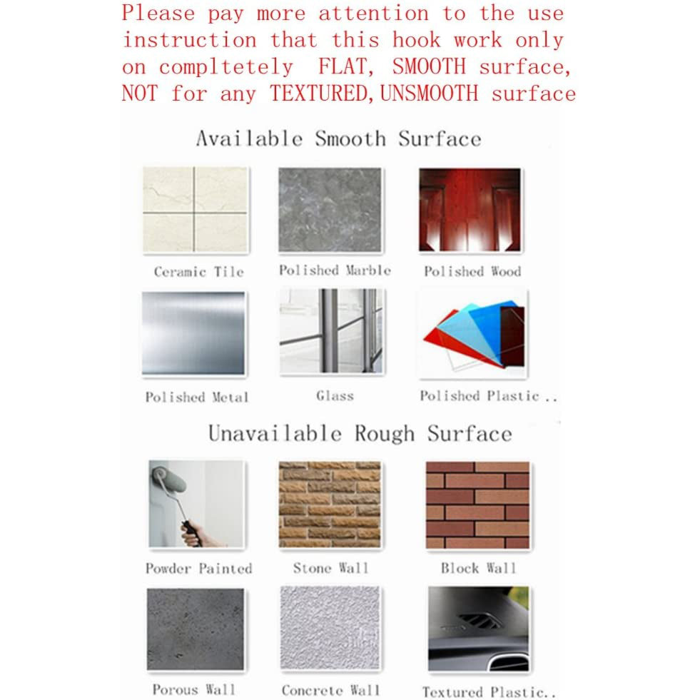 Hinweis: Dieses Produkt wird als Set mit zwei Haken geliefert, die ausschließlich auf nicht-porösen, glatten Oberflächen wie polierten Keramikkacheln, Spiegeln, Glasfenstern, poliertem Edelstahl und Kunststoffplatten funktionieren. Nicht geeignet für poröse, unebene, raue oder strukturierte Oberflächen wie grobe Beschichtungen, unpolierten Marmor oder Holzoberflächen, raue Porzellanfassungen usw.