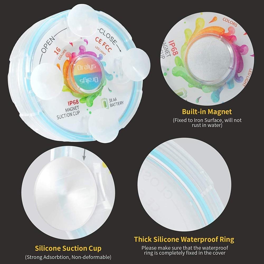 Die Oralys LED Poolbeleuchtung besteht aus hochwertigem, wasserdichtem Material nach IP68-Norm. Der Silikon-Saugnapf hat eine bessere Wasseraufnahmekapazität als die Saugnäpfe konkurrierender Marken und behält auch nach längerer Nutzung seine Form. HINWEIS: Bitte stellen Sie sicher, dass die obere sowie die untere Abdeckung vor dem Eintauchen ins Wasser fest verschlossen sind, um das Eindringen von Wasser in das Licht zu verhindern. Die extrem hellen, dimmbaren Lichter bieten 16 RGB-Farben – die Oralys LED Poolbeleuchtung verfügt über 15 lichtstarke LEDs, 16 Farben, 5 Helligkeitsstufen und 4 dynamische Modi, die verschiedene Dekorationsmöglichkeiten für den Alltag oder besondere Anlässe im Schwimmbad, Teich, Springbrunnen, Aquarium, Fischbecken, Vase, Blumentopf und Badewanne ermöglichen.