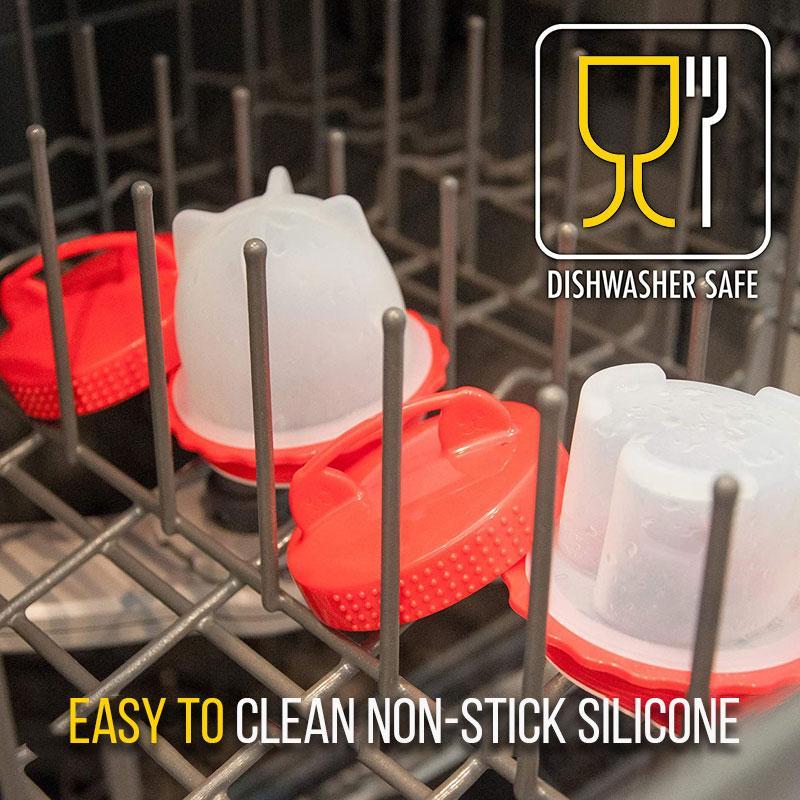 Antihaft-Silikon-Eierbecher - Ein wenig Öl hinzufügen, damit die Eier nicht an den Bechern kleben bleiben. Die thermodynamische Konstruktion sorgt dafür, dass die Eier genau wie in der Schale gekocht werden. Ideal für weich oder hart gekochte Eier, Rühreier, Mini-Omelettes, Eggs Benedict und viele weitere Zubereitungen.