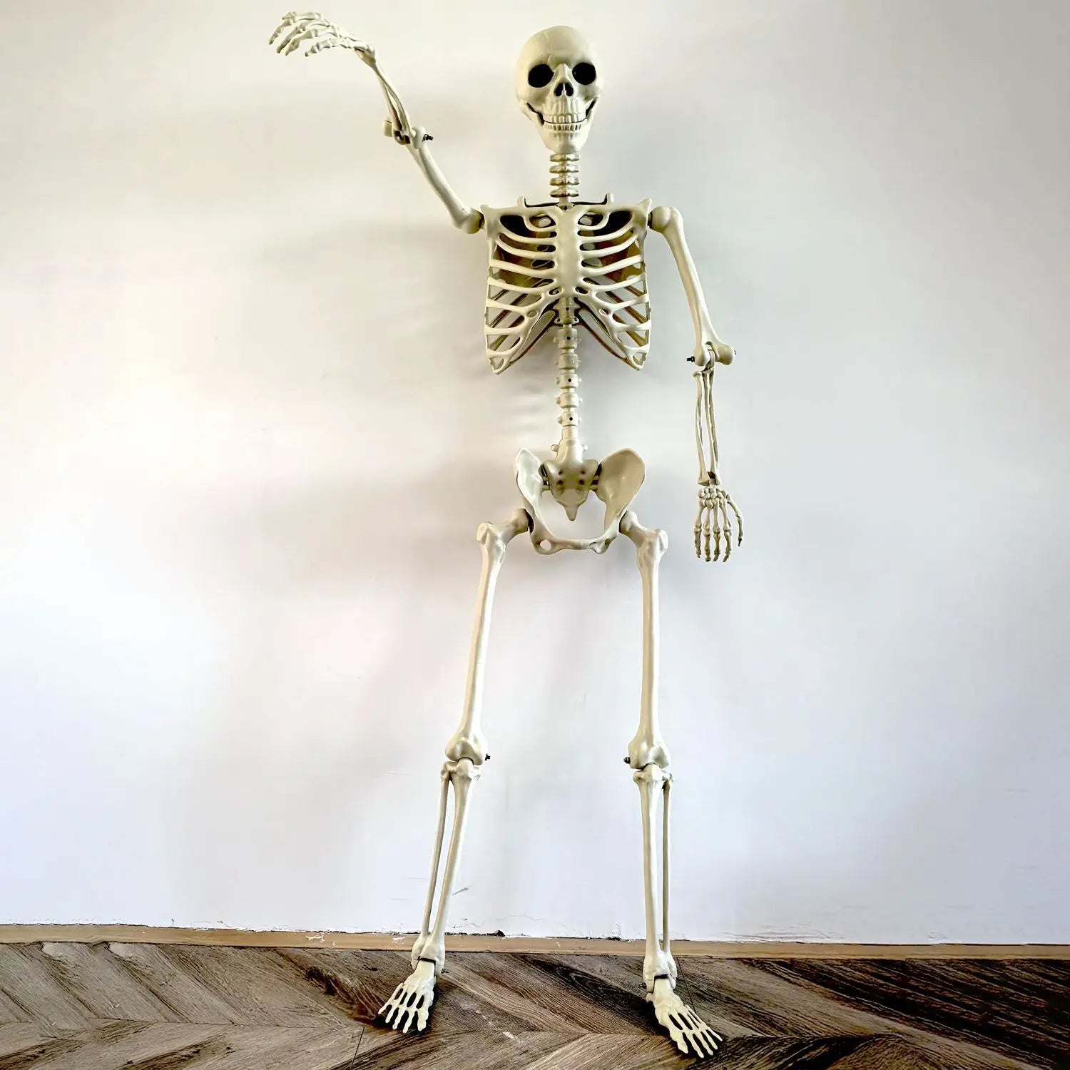 Dieses bewegliche Skelett mit einer Höhe von 90 bis 165 cm ist die ideale Verzierung für Halloween, Horror-Partys oder Inneneinrichtungen, die einen Hauch von schwarzem Humor benötigen. Gefertigt aus leichtem, aber strapazierfähigem Kunststoff, hat es bewegliche Gelenke, die es Ihnen ermöglichen, es in jeder gewünschten Pose zu arrangieren – ob sitzend, stehend, winkend oder entspannt mit einem Ball!