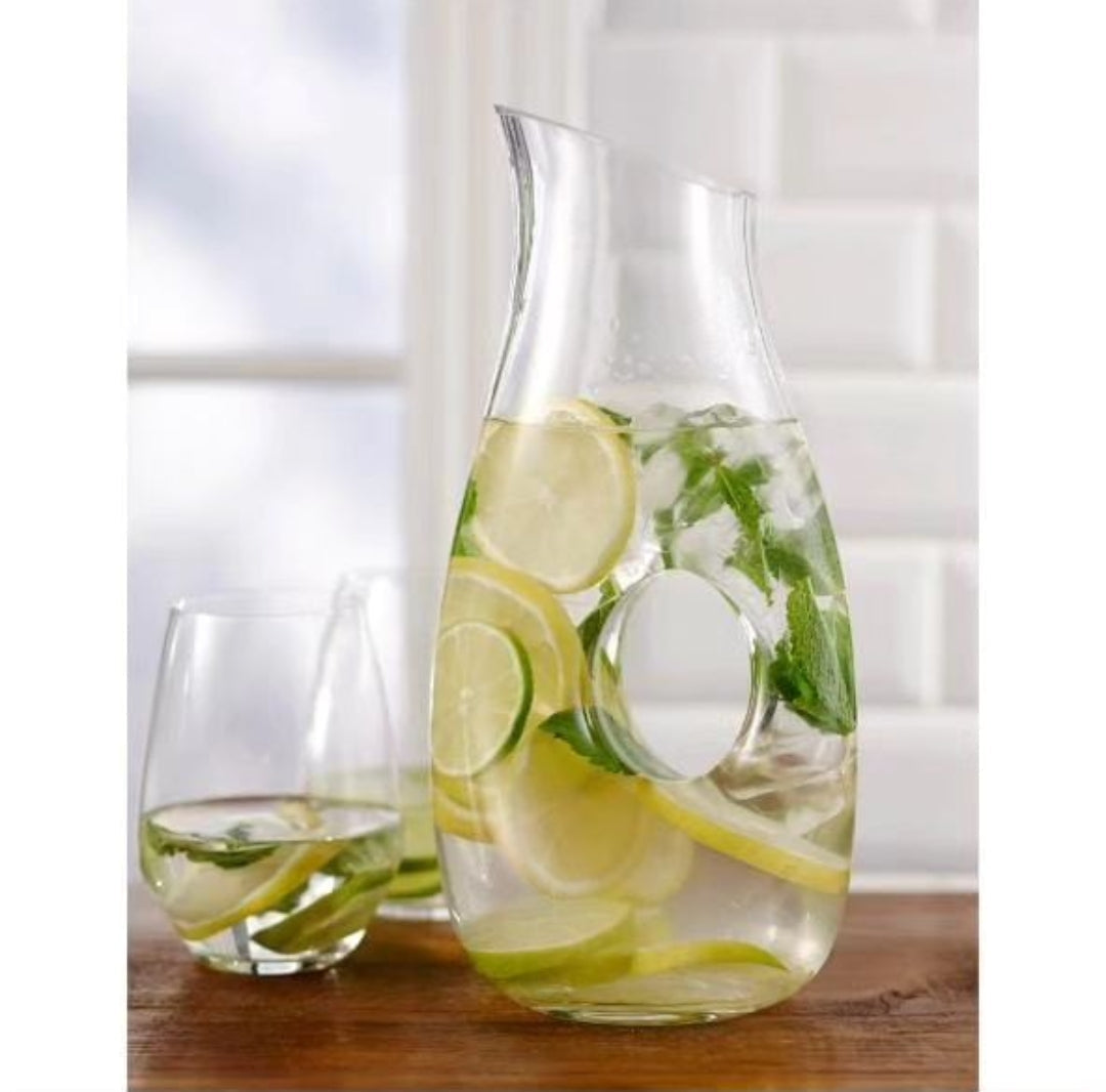 Der Vivolux Dekanter beeindruckt durch seine ausgeprägte bauchige Gestalt und den eleganten, schmalen Hals. Im Zentrum des Gefäßes befindet sich ein rundes Loch. Der Dekanter besticht durch seine klare und glatte Oberfläche. Die Öffnung des Halses ist sanft nach außen gewölbt.