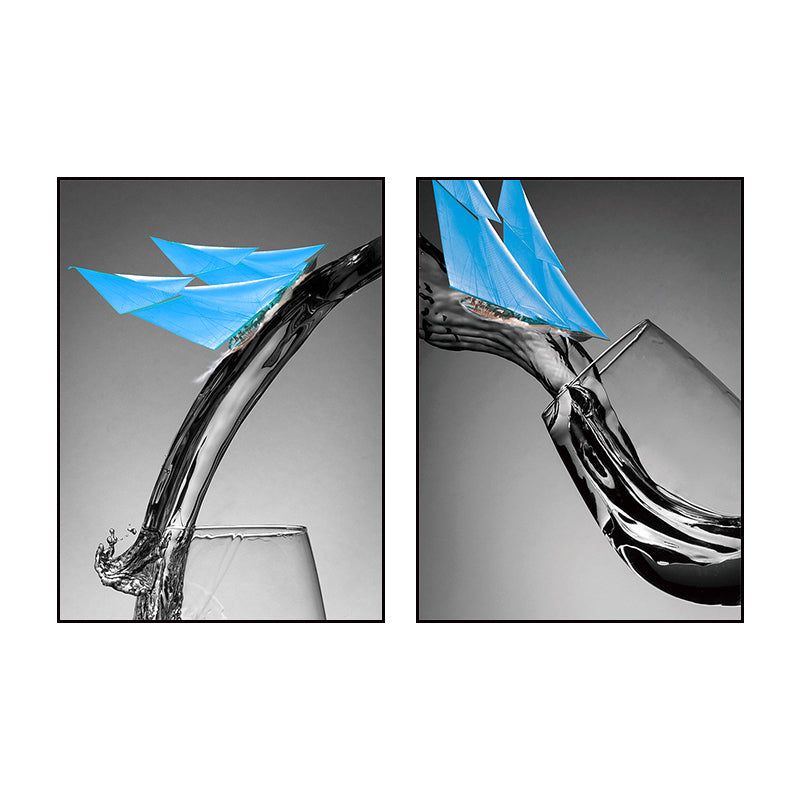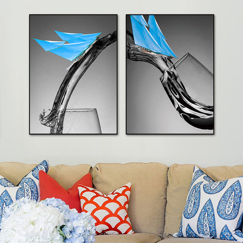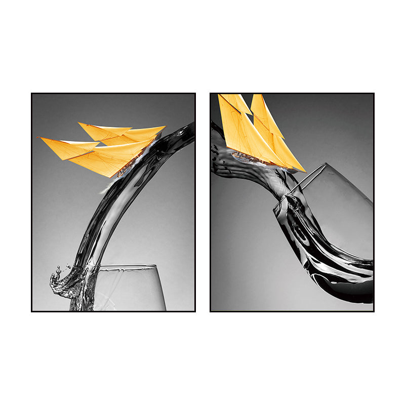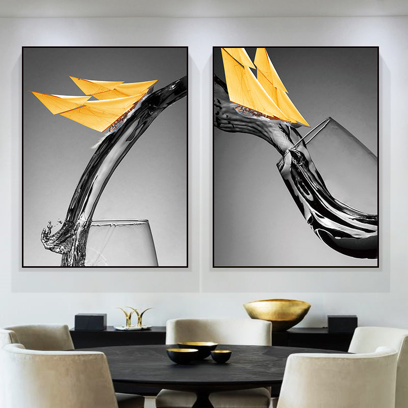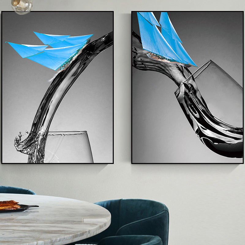 Vivolux | Dunkle Farbige Moderne Leinwand Mischtechnik Papier Boot und Weinglas Wandkunst für Esszimmer