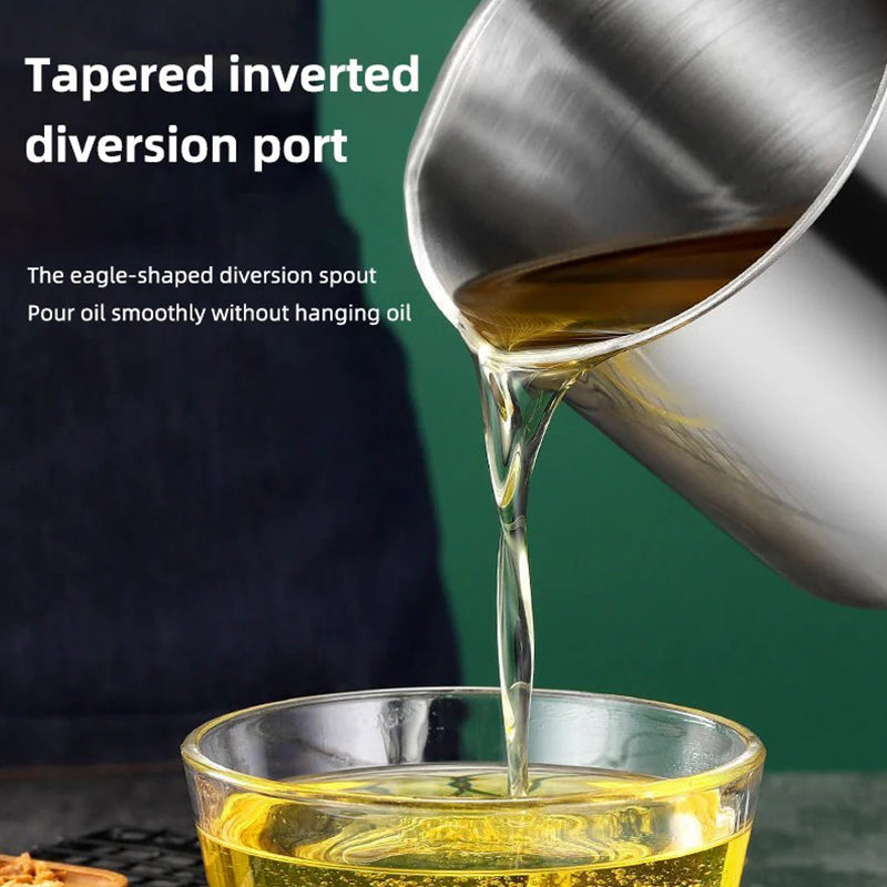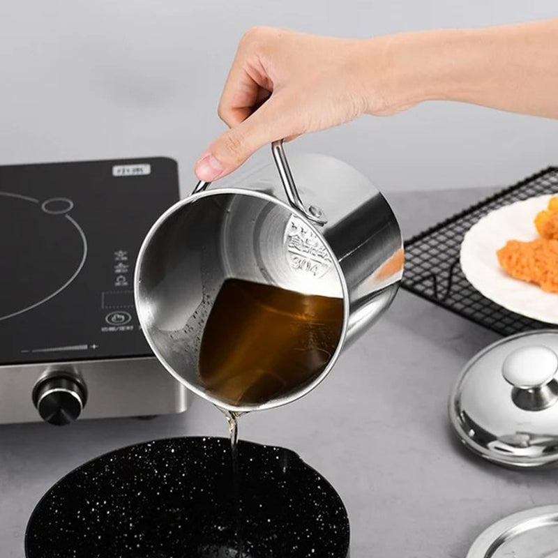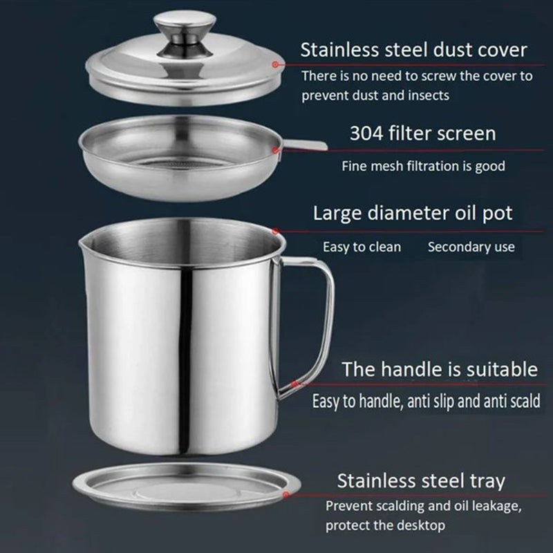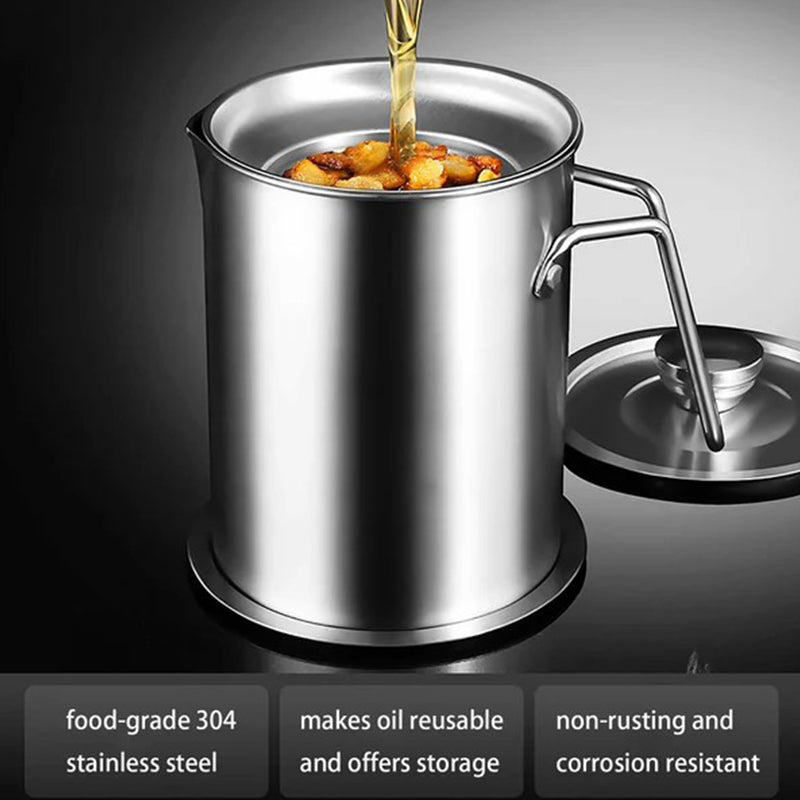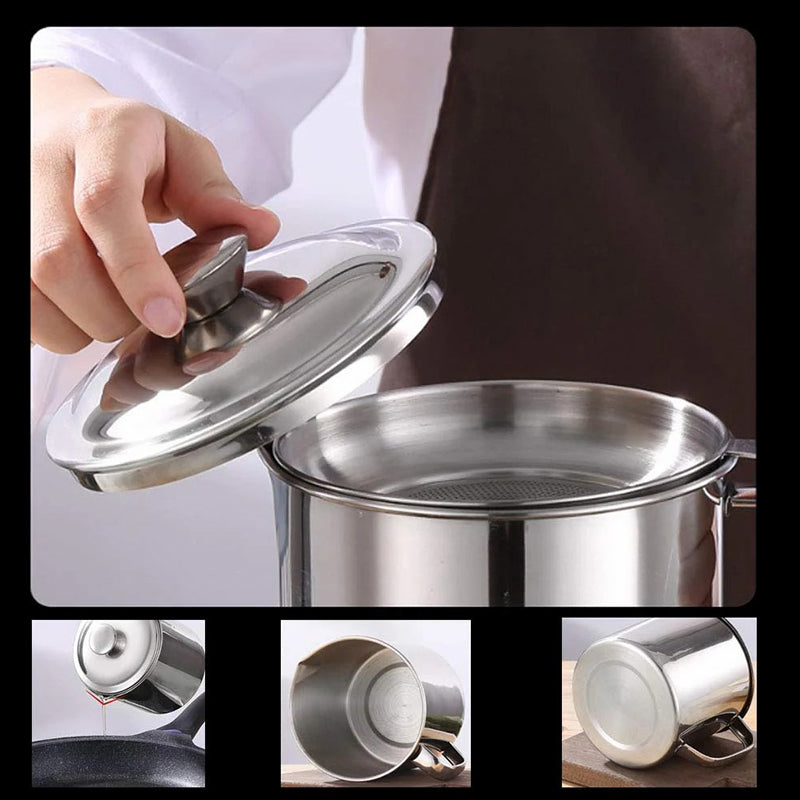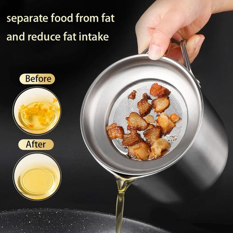 Vielseitige Nutzung: der abnehmbare feine Edelstahlfilter fängt kleine Partikel auf, sodass das Öl jederzeit wiederverwendet und unkompliziert aufbewahrt werden kann.