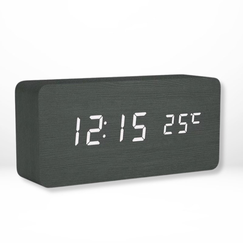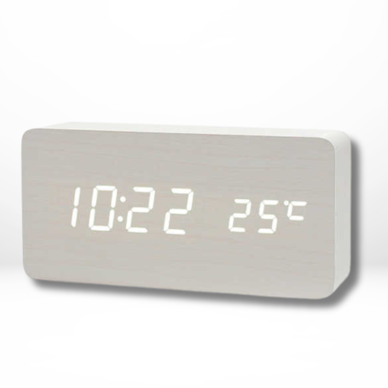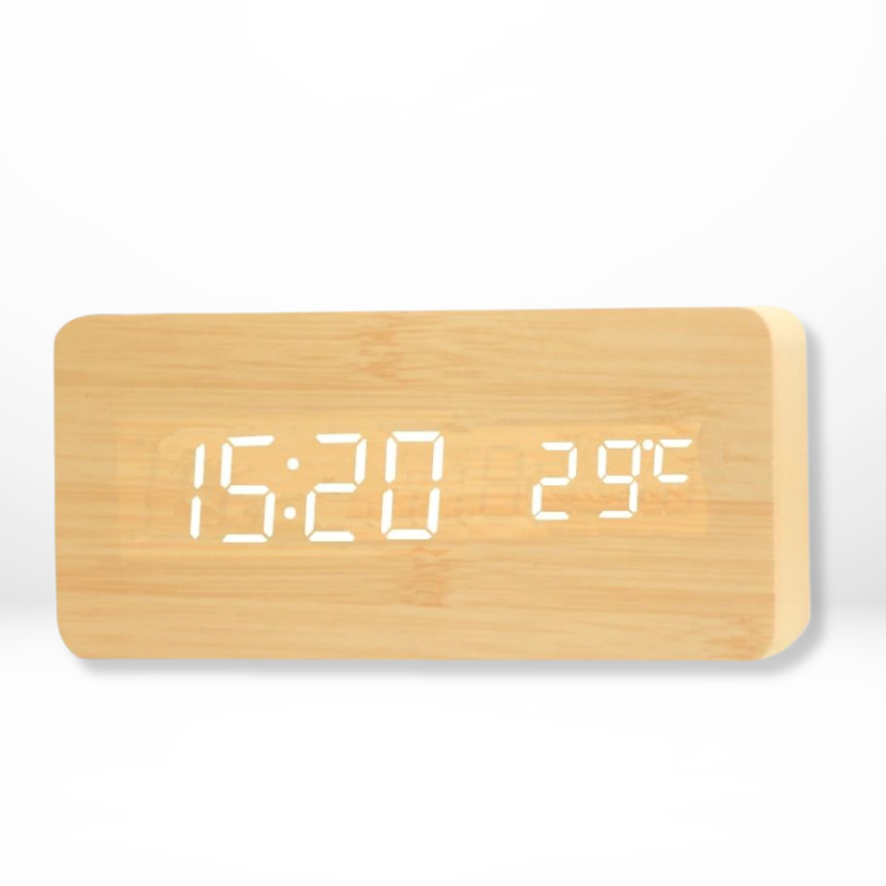 Die Wärme des Naturholzes bringt Ruhe und Harmonie ins Innere, während die subtile LED-Anzeige mühelos die Uhrzeit und Temperatur anzeigt. Es ist ein elegantes Accessoire, das Stil mit Praktikabilität verbindet, perfekt für jedes moderne Zuhause.