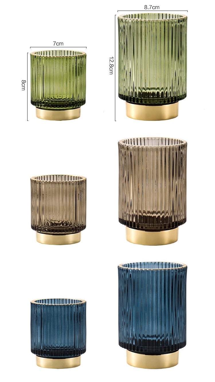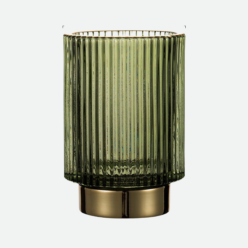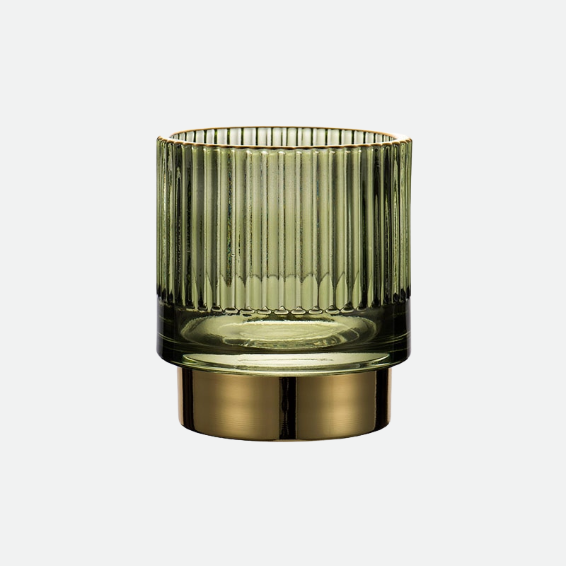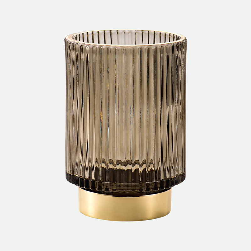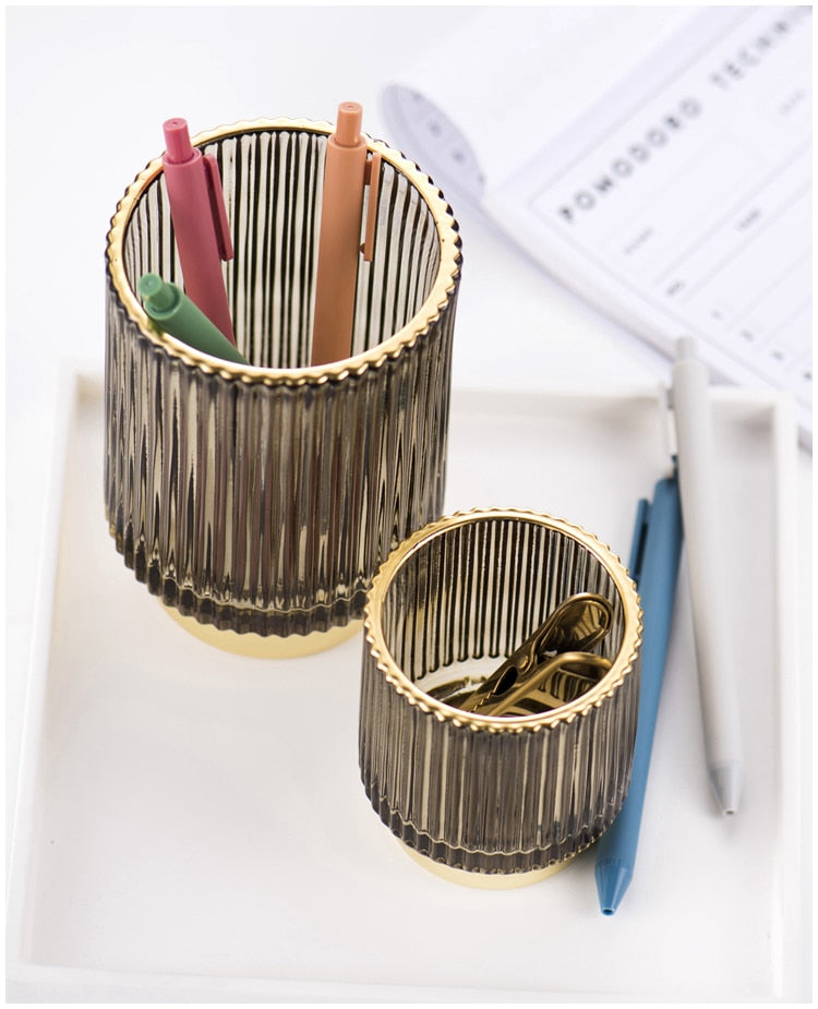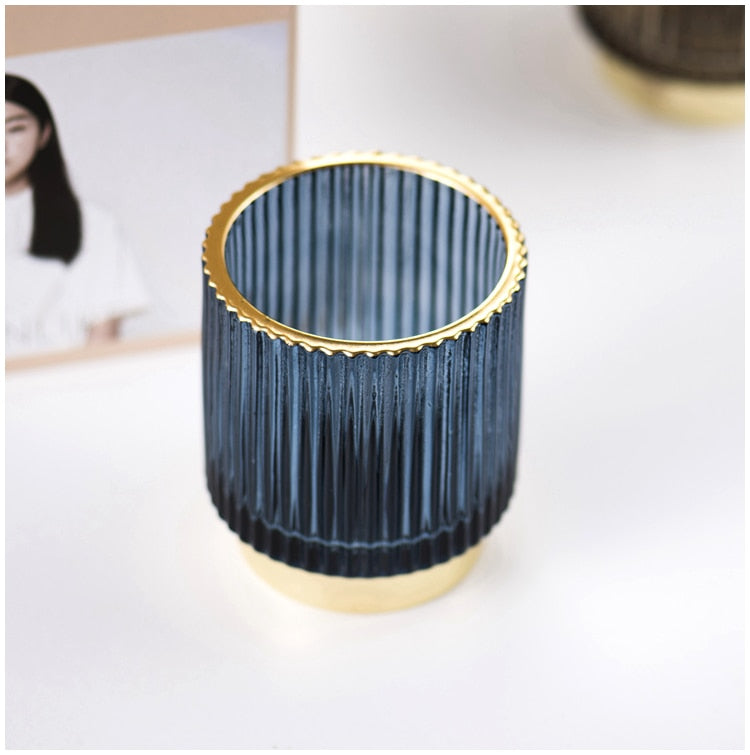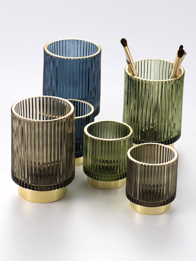 Entdecken Sie, wie wunderbar die Ordnung sein kann. Unser Elise Gold Foil Glas-Make-up-Halter & Organizer sorgt dafür, dass Ihre Make-up-Pinsel und Kosmetikartikel stets ordentlich verstaut sind. Die eleganten Glas-Organizer mit goldener Folie bieten eine stilvolle Möglichkeit, Make-up, Frisurentools und andere essentielle Dinge zu lagern. Halten Sie Ihre Zahnbürsten und Zahnpasta im Badezimmer oder Haaraccessoires im Schlafzimmer stets griffbereit. Wunderschön gefertigt aus hochwertigem getöntem Borosilikatglas mit einer strukturierten Oberfläche, ist unser Elise Gold Foil Glas-Make-up-Halter & Organizer in ansprechenden Farbtönen wie Grün, Braun oder Blau erhältlich. Jeder Organizer präsentiert sich in einem verchromten Metall-Finish und besticht durch attraktive goldene Folienakzente am oberen Rand. Die größere Version bietet Platz für umfangreichere Artikel, während die kleineren Glas-Organizer hervorragend für die Aufbewahrung kleiner Gegenstände wie Haarspangen oder Wattebäuschen geeignet sind. Platzieren Sie diese auf Ihrem Schminktisch, Ihrem Badezimmerwaschtisch oder Schreibtisch und nutzen Sie sie zur Aufbewahrung von Büromaterialien wie Stiften und Scheren. Kombinieren Sie mehrere für eine fesselnde Präsentation auf einem Waschtisch oder Schreibtisch.