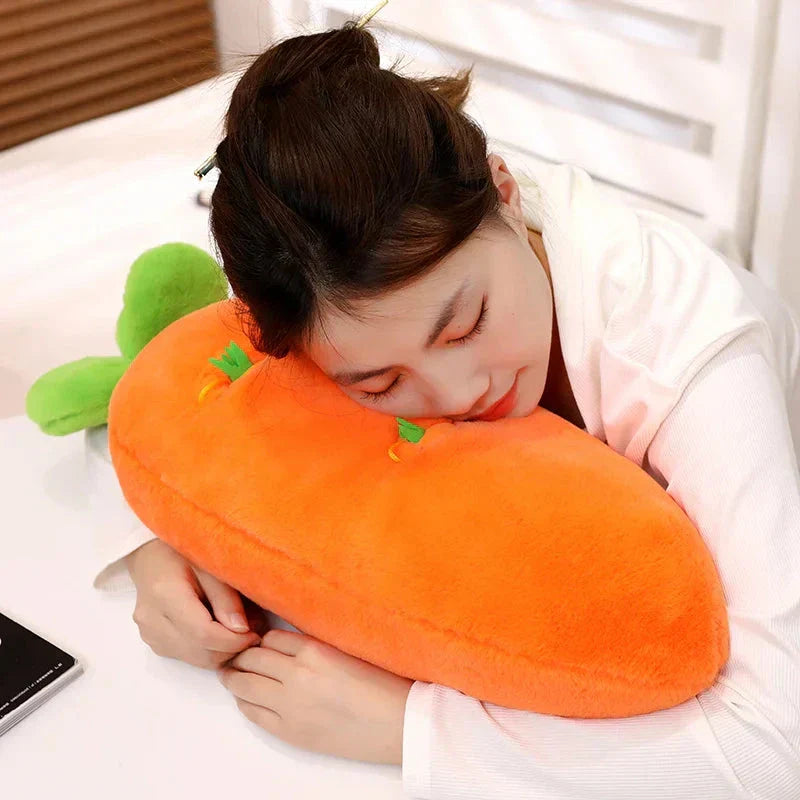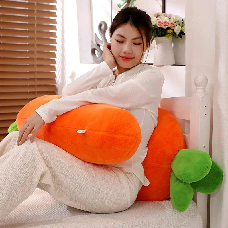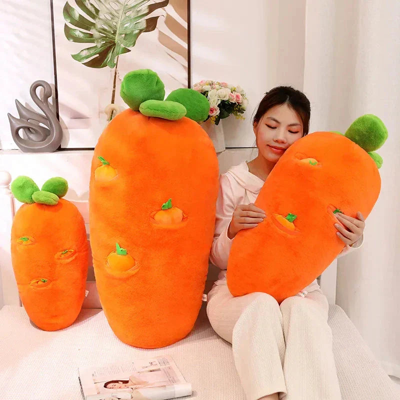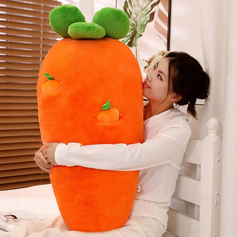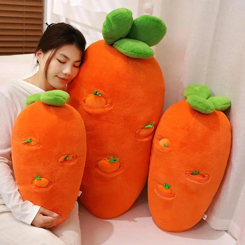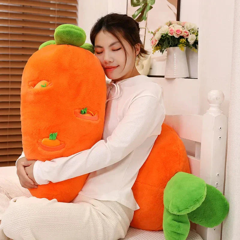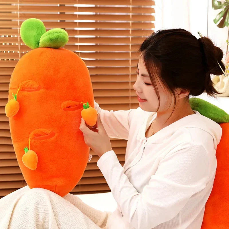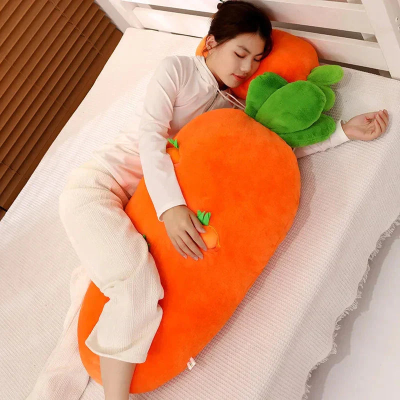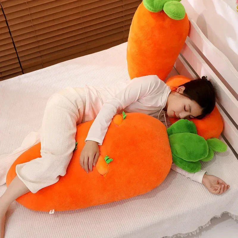 Genieße Essen, Trinken und Schlafen bequem mit diesem Karottenplüschtier, das eine große Karotte und kleinere hängende Karotten enthält, die du herausziehen und wieder einsetzen kannst. Diese Plüschtiere können dabei helfen, Rückenschmerzen zu lindern, wenn du deinen Körper im Schlaf um sie wickelst. Lege dich auf die Seite und mache es dir bequem, indem du dein Bein über das Plüschtier legst.