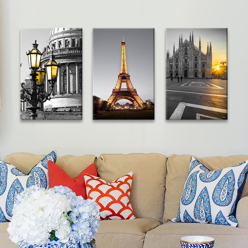 Vivolux | Global Inspirierte Landmarken Wandkunst Set Graue Sonnenuntergang Stadtlandschaft Leinwanddruck für das Wohnzimmer