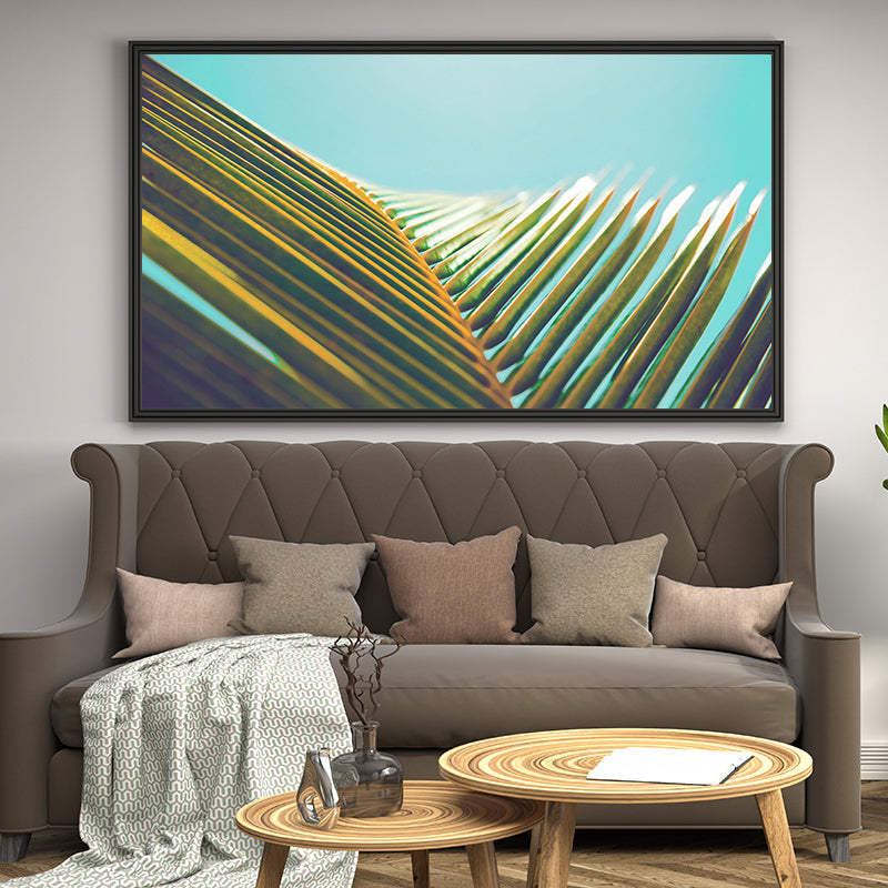 Vivolux | Kokosnusszweig Wandkunst Tropisch Schöne Palmenblatt Leinwanddruck in Grün auf Blau