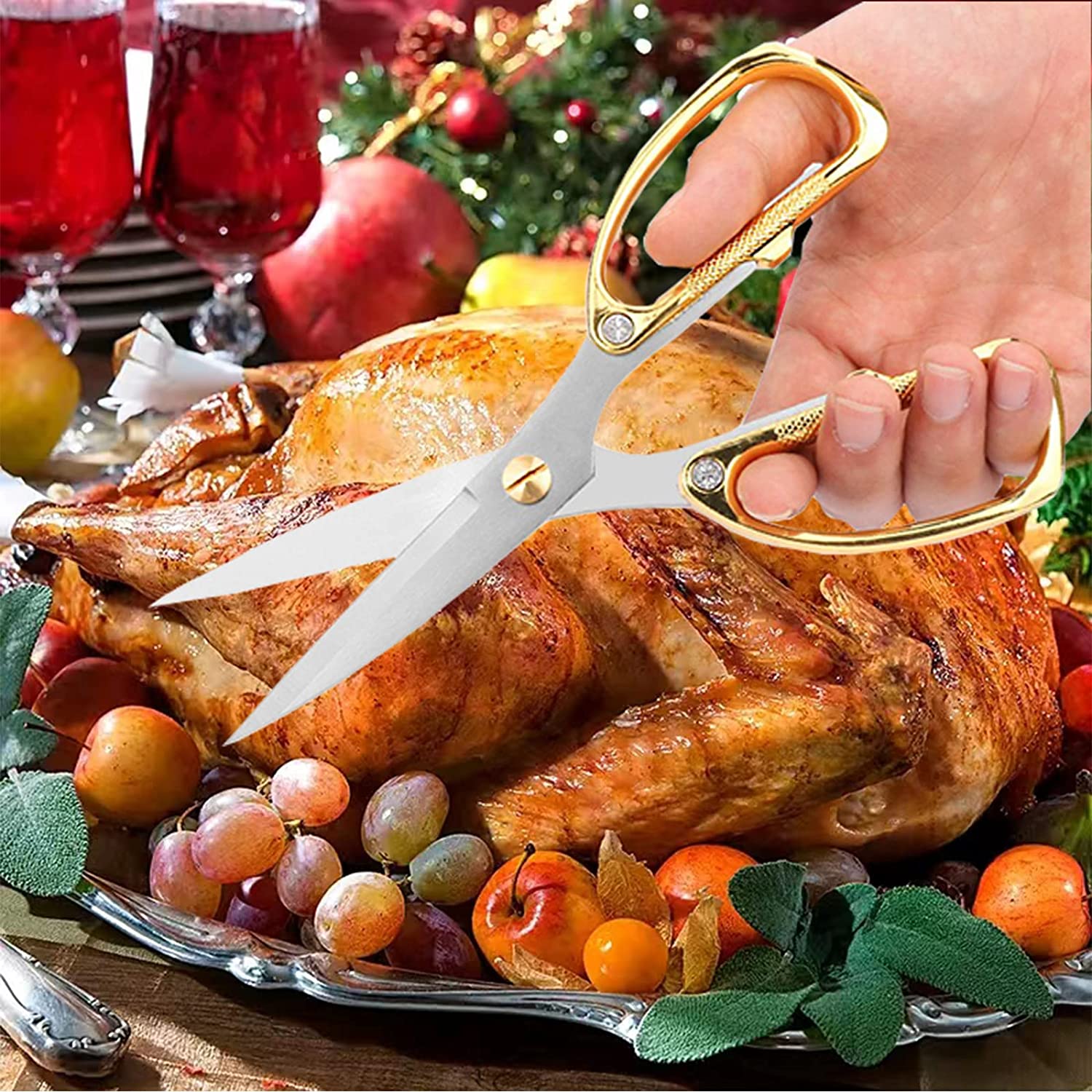 VIELSEITIGE SCHEREN MIT STARKER FUNKTIONALITÄT - Diese vielseitigen Küchenscheren eignen sich für eine Vielzahl kulinarischer Tätigkeiten, darunter das Schneiden von Hähnchen, Rippen, Koteletten, Fleisch, Kräutern und Gemüse sowie für Gartenarbeiten und als Flaschenöffner. Sie sind ideal als Fleischschneider, Küchenscheren für Fleisch, Korianderschneider, die leicht zu reinigen sind, Hähnchenscheren, Truthahnscheren, strapazierfähige Scheren, Fischschneider, Chef-Küchenscheren, Gemüsescheren und Kräuterscheren.