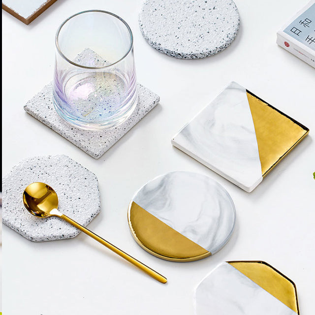 UnserMarmorisierte Keramik-Untersetzer-Set mit Halterist die ideale Wahl für Speisen sowohl drinnen als auch draußen. Diese beeindruckenden Untersetzer-Sets stellen ein elegantes und nützliches Accessoire dar, welches den Schutz Ihrer Möbel vor unschönen Wasserringen gewährleistet und gleichzeitig einen Hauch von Raffinesse zu Ihrer Einrichtung hinzufügt. Mit acht verschiedenen Formen und Designs finden Sie garantiert die optimale Ergänzung für Ihren Tisch.