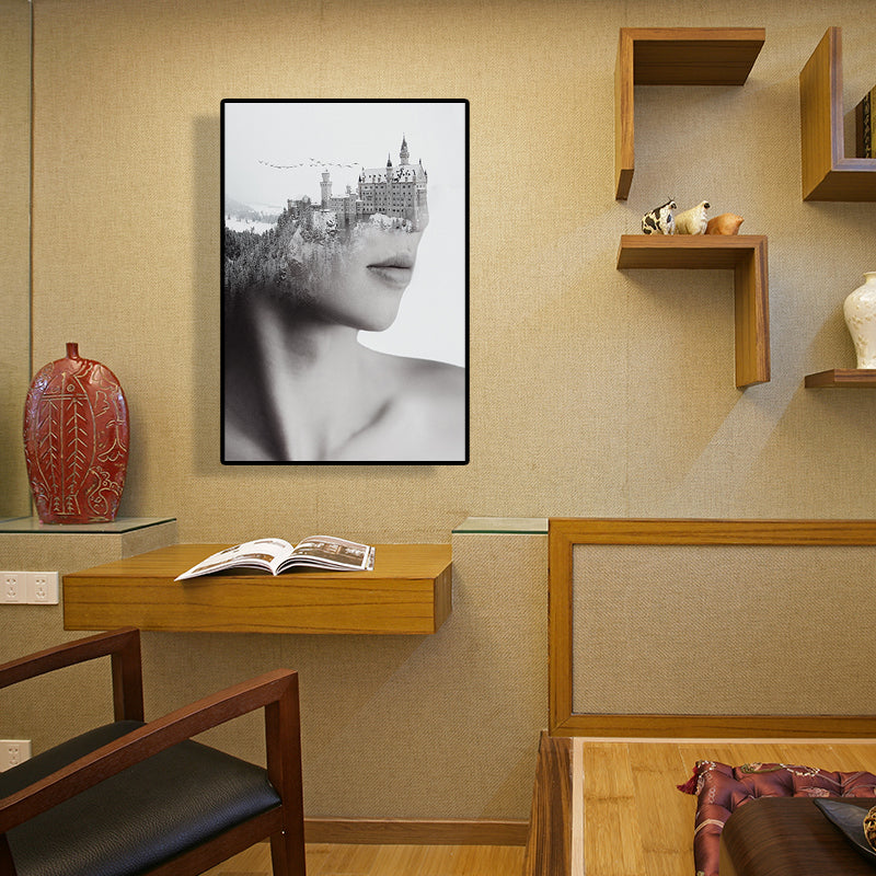 Vivolux | Gemischte Medien Vintage-Leinwandwandkunst mit Frauen- und Bergschlossmuster in Grau