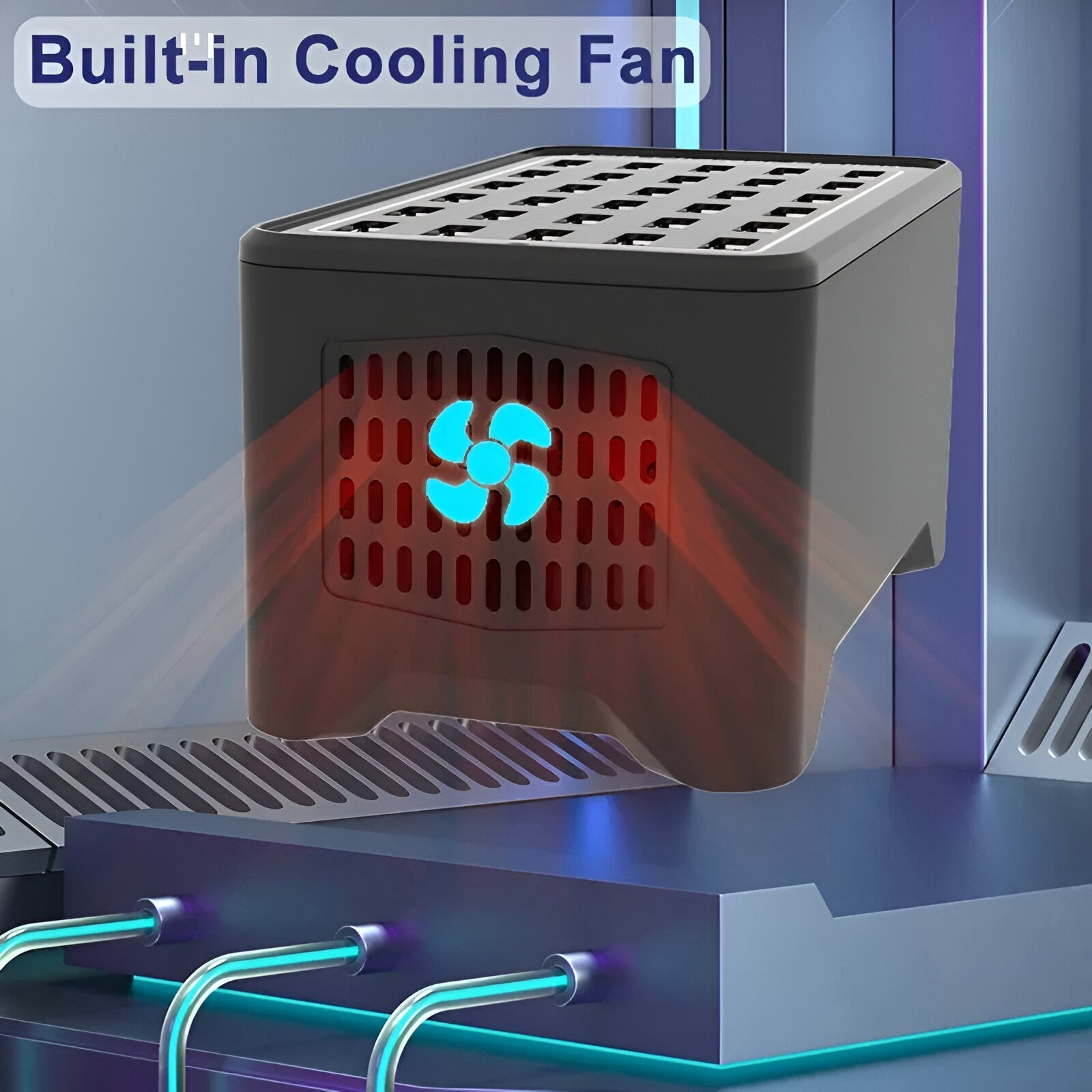 Ein eingebauter Lüfter und eine rutschfeste Basis gewährleisten ein sicheres und stabiles Laden, ohne Überhitzungsgefahr.