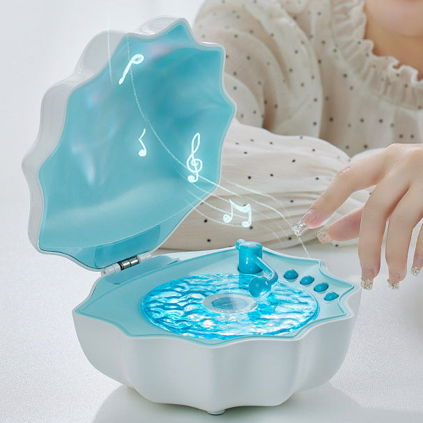 Die Muschelschalen-Plattenspielerlampe vereint Stil mit Funktionalität. Ihr ?Aussehen erinnert an eine geöffnete Muschel und verbirgt im Inneren ein plattenspielerähnliches Gerät, was sie zu einer praktischen Nachtlampe und Bluetooth-Lautsprecher macht. Wenn das Licht eingeschaltet ist, reflektiert die strukturierte Oberfläche der „Platte“ wunderschöne, funkelnde Wasserlichter und schafft eine zauberhafte Atmosphäre in jedem Raum.
