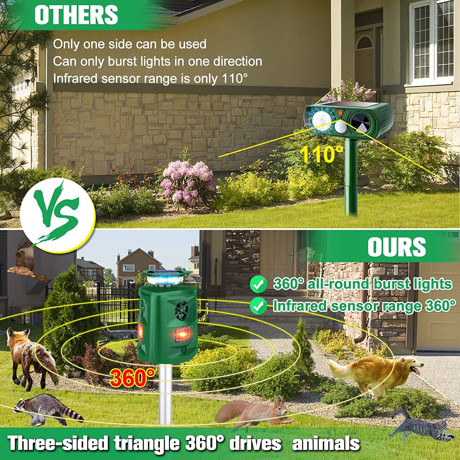 Innovatives 360° Ultraschall-Tierabwehrsystem: Dieses Solar-Ultraschallgerät zur Tierabwehr kommt mit einem optimierten Design, das Infrarotsensoren auf allen Seiten umfasst. Es nimmt kleine Bewegungen von Eindringlingen in einem 360°-Radius bis zu 9 Metern Entfernung wahr. Durch Ultraschalltechnologie, Alarmtöne und integrierte Lichtquellen werden Tiere wirkungsvoll von Ihrem Haus, Garten und eingezäunten Flächen ferngehalten.