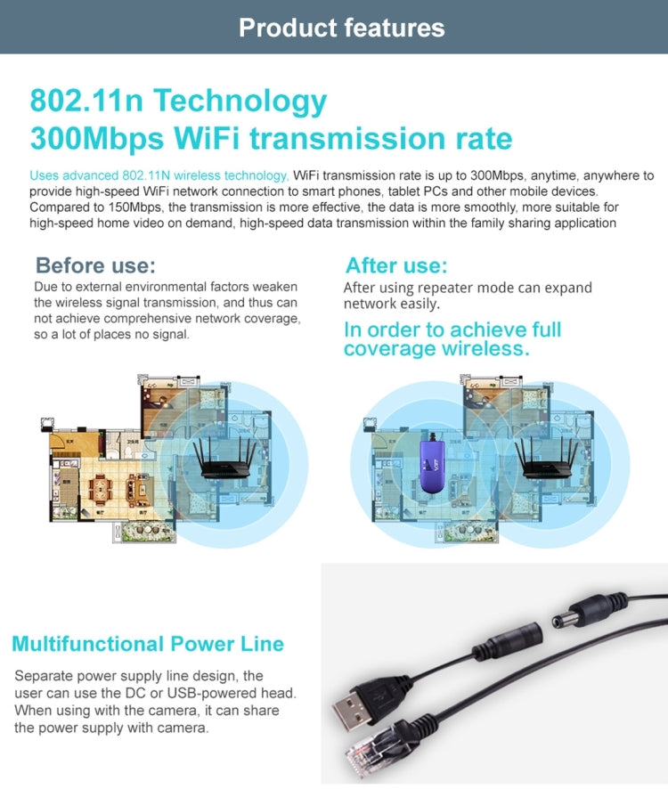 2. Unterstützt das WLAN-Übertragungsprotokoll 802.11b/g/n mit einer Übertragungsrate von 300Mbps.