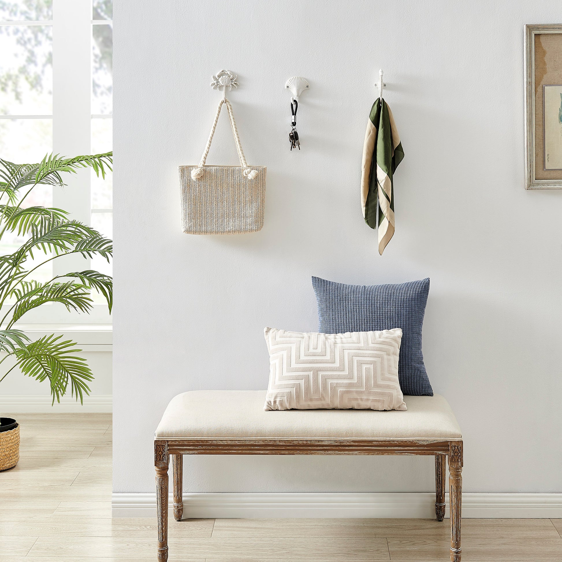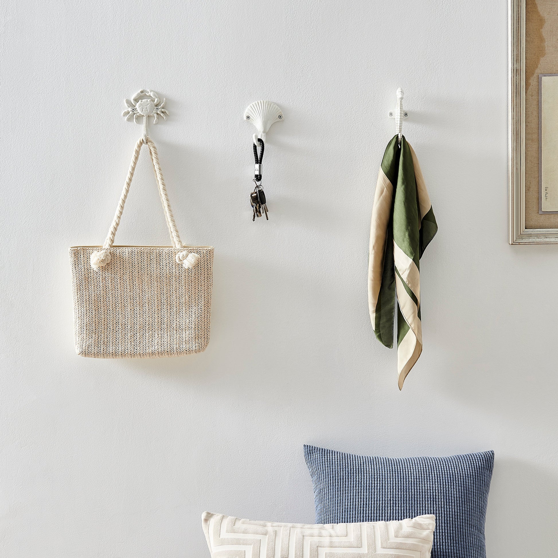 Das Danya B. Weiße Gusseisen Nautical Wandhaken-Set bringt die stille Eleganz des Meeres in Ihr Zuhause und vereint maritimen Stil mit nützlicher Funktionalität. Dieses Set besteht aus drei stilvoll gestalteten Haken, die jeweils eine Muschel, einen Krebs und ein Seepferdchen darstellen. Perfekt, um einem Raum eine maritime Note zu verleihen, bieten diese dekorativen Haken eine elegante Möglichkeit, Ihr Umfeld zu organisieren. Jeder Haken ist aus langlebigem Gusseisen gefertigt und erscheint in einem frischen Weiß, wodurch er sowohl Robustheit als auch einen zeitlosen Küstenstil ausstrahlt. Die kunstvollen Details jeder skulptierten Wandfigur bringen Charakter und Eleganz in jede Wand und dienen sowohl als maritimes Wandkunstwerk als auch als praktische Aufhängehaken. Ob Sie sie verwenden, um Handtücher und Bademäntel in einem strandlich inspirierten Badezimmer oder Schürzen und Küchenutensilien in einer hellen Küche aufzuhängen, die Einsatzmöglichkeiten dieser schlichten, aber funktionalen skulptierten Haken sind grenzenlos. Das weiße Finish sorgt für ein sauberes und frisches Aussehen, das zu verschiedenen Einrichtungsstilen passt, von Küsten- und Landhausstil bis hin zu modern und elegant. Ihr wandmontiertes Design ermöglicht eine unkomplizierte Installation, sodass Sie jeden Haken mühelos in den gewünschten Raum integrieren können. Ob Sie diese gemeinsam für ein harmonisches Gesamtbild anbringen oder einzeln in Ihrem Zuhause aufstellen, diese Haken bieten sowohl Zweckmäßigkeit als auch dekorativen Charme. Mit ihrer stabilen Bauweise und ihrem zeitlosen Design werden diese Wandhaken sicherlich ein geschätzter Teil Ihrer Inneneinrichtung für viele Jahre sein. Ideal für von Strandhäusern inspirierte Dekorationen oder als durchdachtes Geschenk für jeden Meerliebhaber stellt das Danya B. Weiße Gusseisen Nautical Wandhaken-Set eine hervorragende Möglichkeit dar, jeder Wand in Ihrem Zuhause maritimen Charme zu verleihen.