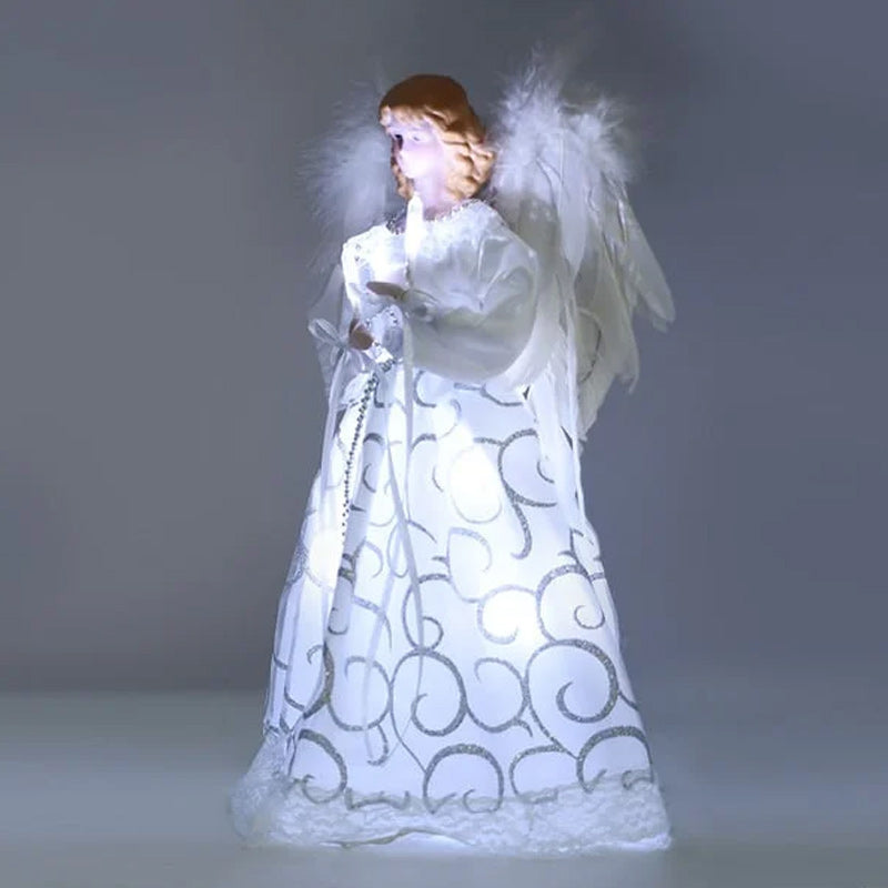 Die beweglichen Flügel des Engels sind mit farbiger Glasfaserbeleuchtung ausgestattet. In seiner Hand hält er einen warmweißen, glitzernden Stern.